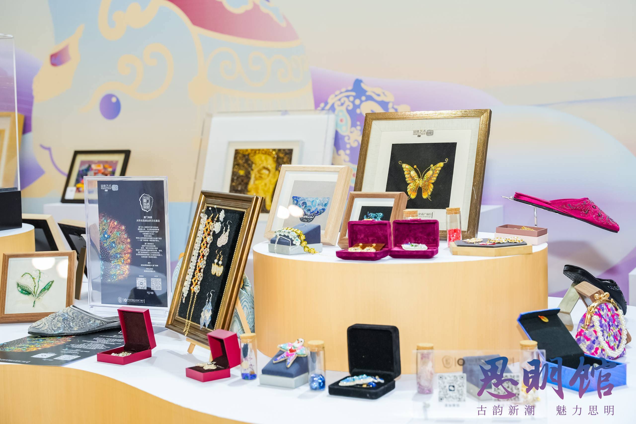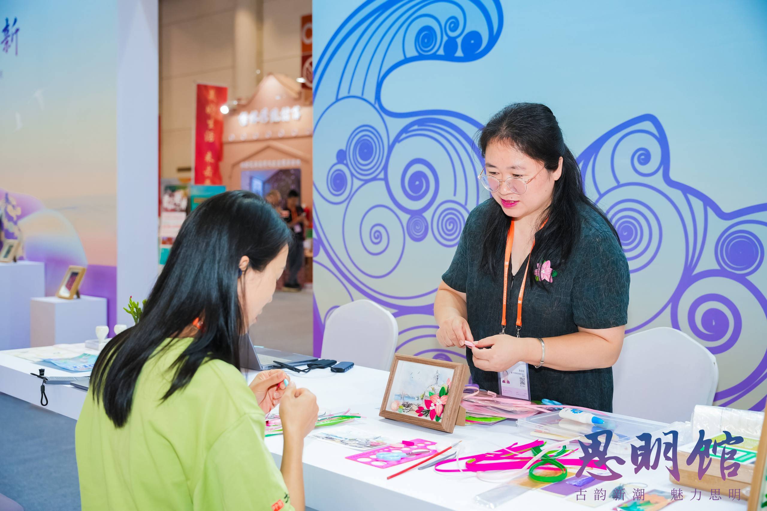 与此同时,除了主展馆精选的各色展品外,在思明区的标展区,还有来自思明的近40家文创企业带来了各自的特色产品,非遗漆线雕、非遗大漆、非遗绒花、非遗布贴画、非遗泥塑等非遗产品在这里百花齐放,更有别致的纸艺、花艺类文创及各类茗茶点缀其间。