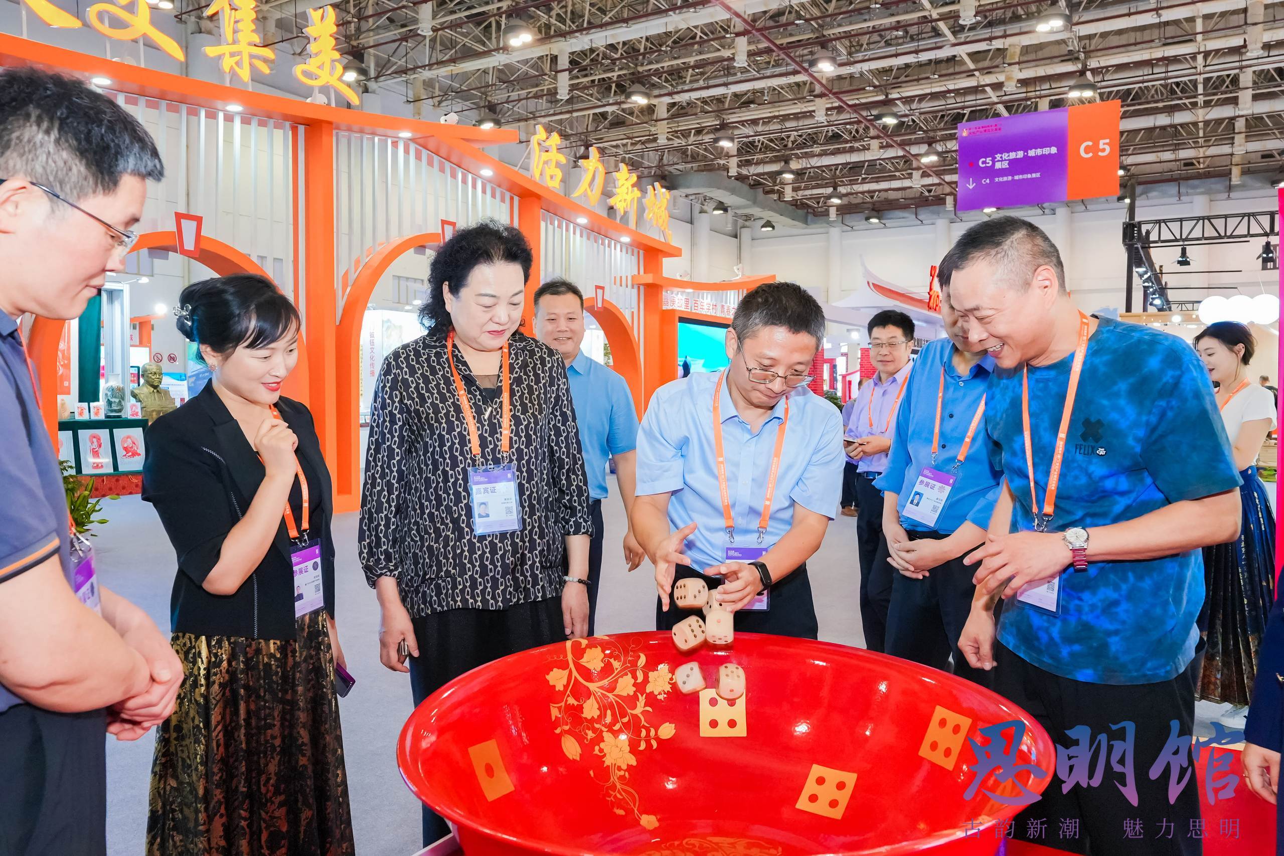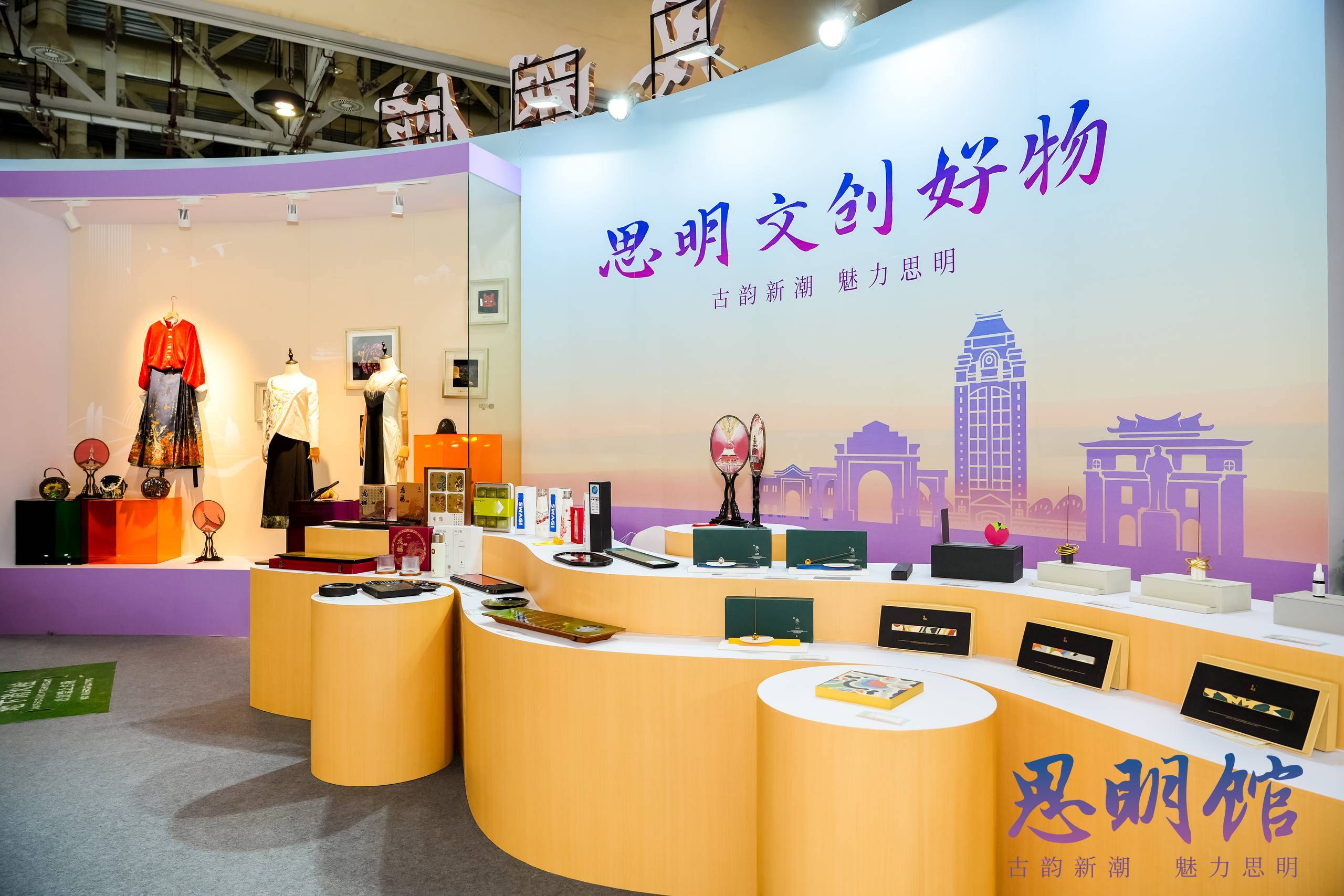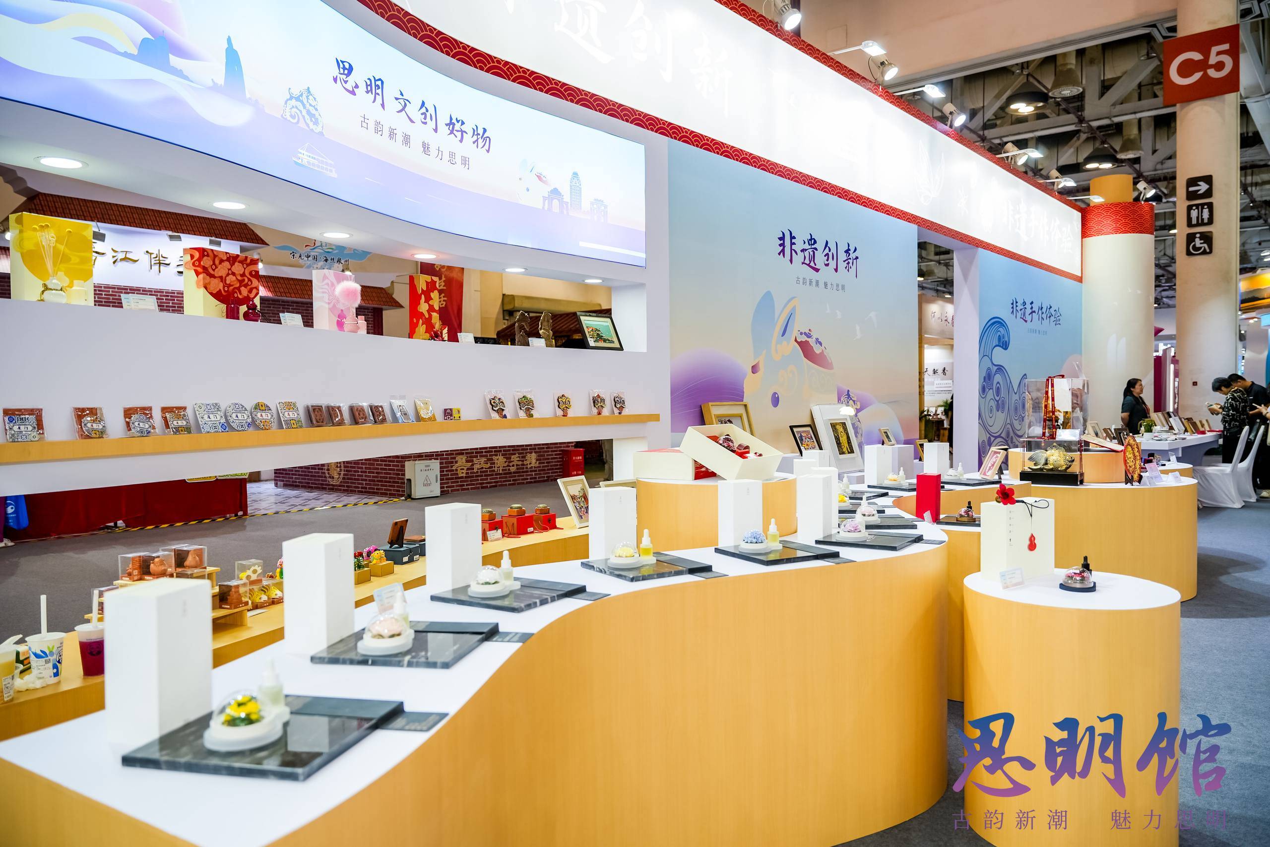 位于厦门国际会展中心C5展厅的思明主题馆,在540平方米的场馆内,将思明城市地标、成功文化等元素融入整个展馆设计和活动中,共设置了文旅融合、文创好物、非遗创新及数字文娱四个展示区,不仅展示了思明区文创产业的发展成果和靓丽风采,更独具匠心地安排了博饼、品茶、非遗手作体验这三个独特的体验活动,让所有来思明馆的市民和客商们在体验思明特色高品质文化的同时,摇身一变成为“四有新人”:有的看、有的喝、有的玩、有的拿。